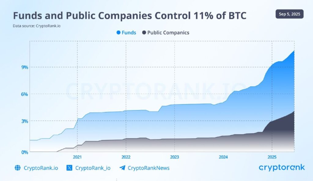 到2025年秋季,公司和基金已积累了 大约11% 比特币的流通量。越来越多的机构将数字货币纳入他们的储备,如果这种趋势持续下去,BTC的价值将会增长。