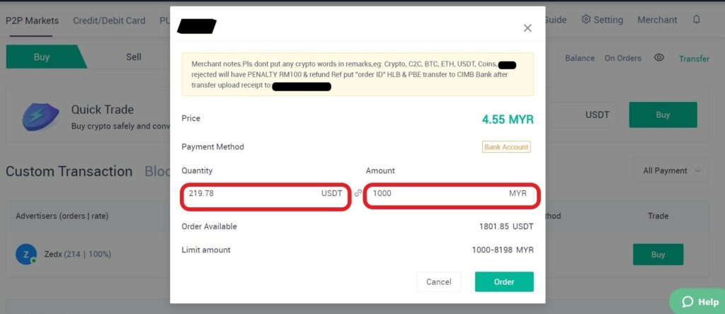 法币交易不会自动完成。购买后,请使用卖家提供的银行账户信息将资金转给卖家。请使用与您的身份关联的账户进行转账。否则,您的交易可能会延迟。