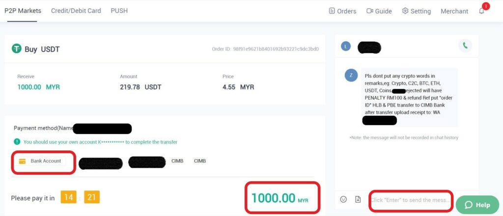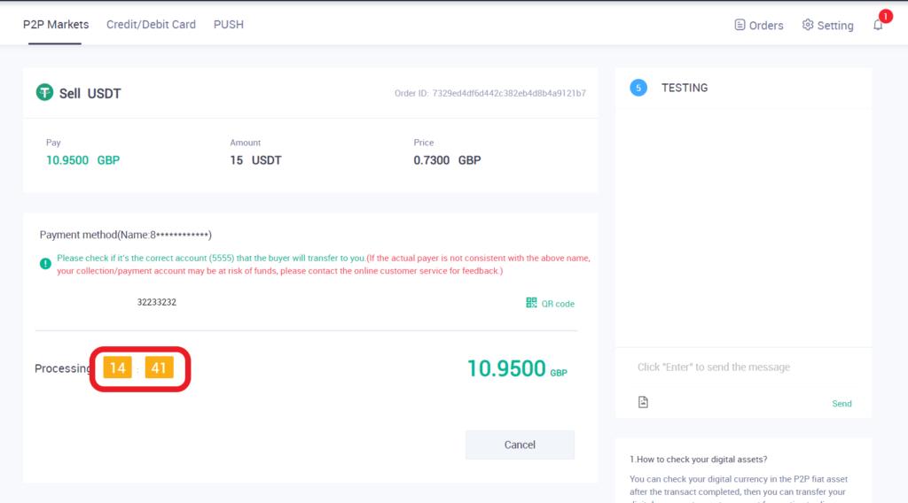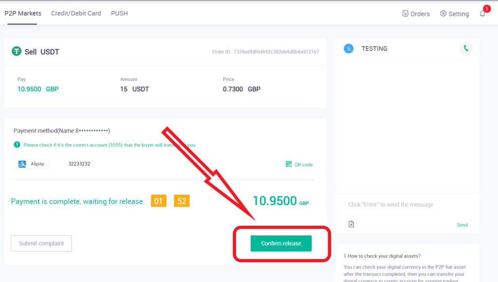 请注意,您只能通过已确认的银行账户收款。收到付款后,请务必点击“确认转账”按钮,将代币转给买家。否则,交易将无法完成。