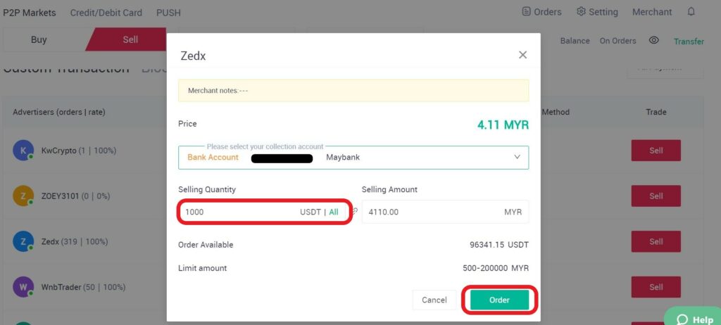 然后,您可以选择要出售的代币数量,或指定您希望接收的马来西亚林吉特金额。点击“下单”按钮完成交易。