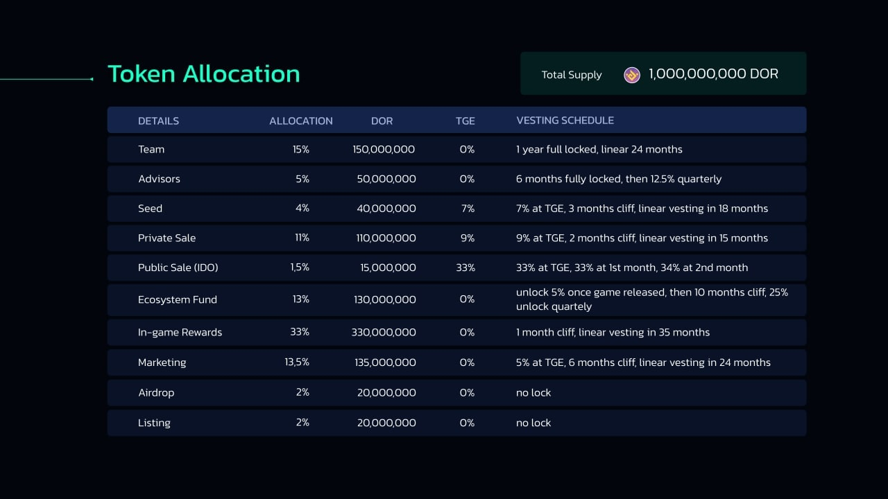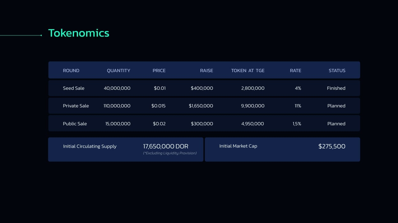 代币经济方面,$DOR 的总供应量为 1,000,000,000。初始市值为 275,500 美元。总代币发售量为 165,000,000 DOR。