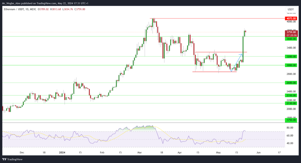 在美国可能批准以太坊 ETF 的希望重燃之前,以太坊价格从 3 月 12 日接近 4100 美元的峰值持续下跌。ETF 的热潮推动以太坊价格升至两个月来的最高点 3840 美元。