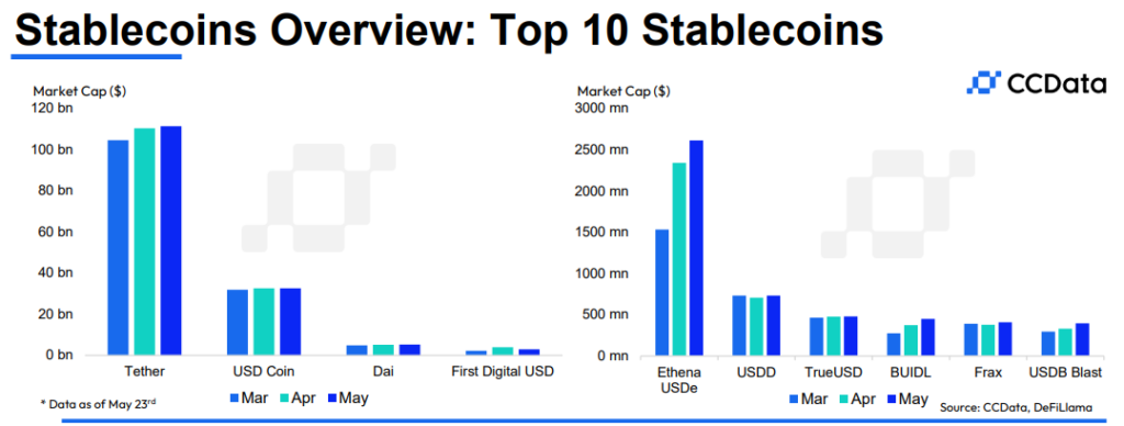 根据CCData 的报告,2024 年 5 月,稳定币的总市值攀升至令人瞩目的 1610 亿美元,这是自 2022 年 4 月以来的最高水平。这一里程碑标志着稳定币市场连续第八个月增长,并表明市场已从 2022 年 TerraUSD 崩盘后的低迷状态中完全复苏。
