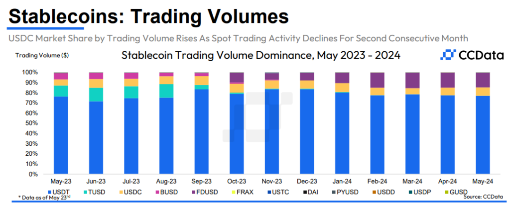 CCData的报告进一步分析了稳定币的交易量,指出在经历了连续七个月的增长后,4月份交易量略有下降。中心化交易所(CEX)的稳定币交易额达到1.46万亿美元,其中USDT继续保持主导地位,市场份额高达77%。